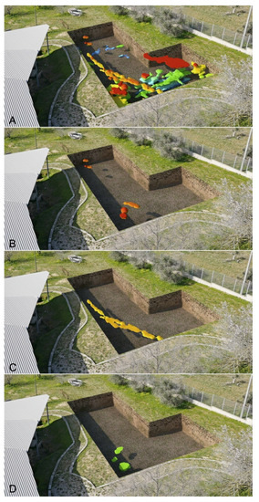 3D reproduction of the anomalies under the soil in the area A inserted in a digital photo: (A) general view of the anomalies; (B) slice of the anomalies at depth of about 60 cm; (C) slice of the anomalies at depth of about 90 cm; (D) slice of the anomalies at depth of about 180 cm.