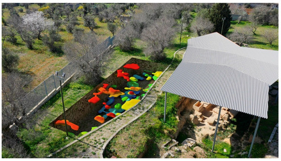 Between 1981 and 1985, archaeological excavations were carried out in the Messapian necropolis of Monte D’Elia. The investigations involved a large sector of the necropolis and they brought to light about 60 tombs, whose grave goods attest that the use of the funerary area, related to the settlement of Aletion/Aletium, was between 6th and 2nd century BC (Figure 6) [1,3,4,5,19,20,21,22,23,24,25,26]. The funerary types vary from the pit graves with cover consisting of a slab of local calcarenite, dating in the Archaic period, to the monolithic sarcophagi and to the large chests made of more calcarenite slabs, covered by one or more slabs, and in use between 5th and 3rd century BC. Various not inscribed cippi in calcarenite have also been found, associated with both Archaic and Hellenistic tombs [24,27,28]. They are of parallelepiped shape (exemplifying measures: 34 × 22 cm, height 65 cm).