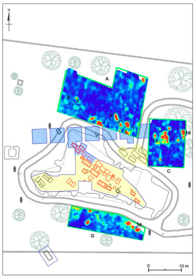 Archaeological map of the Monte D’Elia necropolis with the georeferenced time-slices of the seven areas investigated: A: time-slice at 34–58 cm depth; B: time-slice at 33–56 cm depth; C: time-slice at 28–47 cm depth; D: time-slice at 68–87 cm depth; E: time-slice at 41–60 cm depth; F: time-slice at 41–60 cm depth; G: time-slice at 41–60 cm depth.