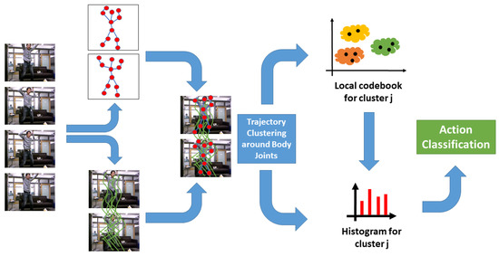 3D Trajectories are adapted to 3D Localized Trajectories by following the procedure described in Section 4, as depicted in Figure 4. Similarly as before, we propose to enhance the discriminative power of 3D Trajectories by grouping them around 3D body joints. Hence, Equations (3)–(5) are adapted accordingly to incorporate all three dimensions of 3D trajectories and 3D joint trajectories . Then, during feature encoding, every histogram of joint clusters defined in Equation (6) is modified to include the descriptors used in this context, becoming: