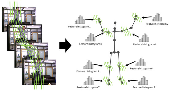 To that end, the pose information through estimated 3D skeletons is used as prior information to estimate an optimal clustering configuration, as depicted in Figure 2. Let us consider the human skeleton extracted from RGB-D cameras composed of J joints and let us denote the trajectory of each skeleton joint j as . Note that we assume that the joints are always well detected. We use the distance proposed by Raptis et al. [43] to group Dense Trajectories of an action around joints. Given a pair of dense and joint trajectories, respectively, and , which co-exist in the temporal range , the spatiotemporal distance between two given trajectories is expressed using: