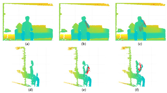 Scene flow-generated motion trajectories. Three phases of the same action are illustrated: (a–c) the frontal view of a subject drinking water is displayed as a point cloud, along with the corresponding motion trajectories in red; and (d–f) the same sequence is illustrated from the side. The capture of both lateral and radial motion shape is clearly depicted.