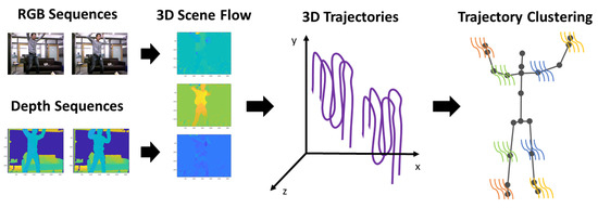 where and are the image plane central point coordinates, and are the respective x and y components of the focal length and D is the depth value. Subsequently, trajectories of the mapped 3D points are estimated using Equation (1), except that the motion field is now based on an estimated scene flow. The estimated 3D Dense Trajectories are denoted as: