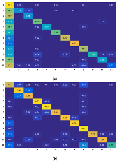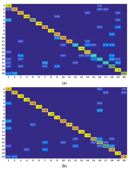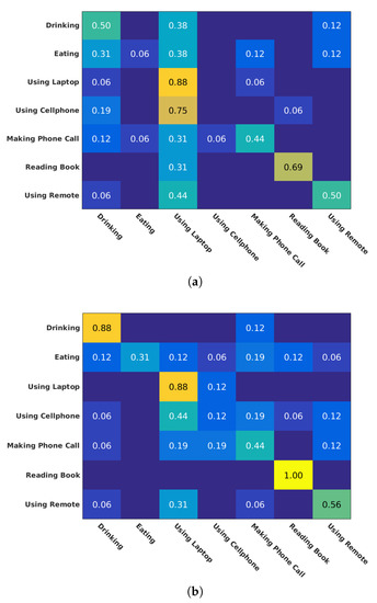 Second, 2D Localized Trajectories approach does not capture radial motion sufficiently. Action classes such as Playing the guitar in MSR DailyActivity3D dataset include a notable amount of radial motion and the accuracy results are consequently low, as demonstrated in Figure 8a,b. For that reason, as mentioned above, the proposed 3D Localized Trajectories presents as a good alternative to solve these two issues. Performance of the 3D Localized Trajectories are reported in the next section.