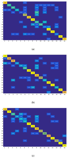 Confusion matrices obtained for (a) Dense Trajectories, (b) 2D Localized Trajectories and (c) 3D Localized Trajectories approaches on MSR DailyActivity 3D dataset. Actions list: (1) Drink; (2) Eat; (3) Read book; (4) Call cellphone; (5) Write on a paper; (6) Use laptop; (7) Use vacuum cleaner; (8) Cheer up; (9) Sit still; (10) Toss paper; (11) Play game; (12) Lie down on a sofa; (13) Walk; (14) Play guitar; (15) Stand up; and (16) Sit down.