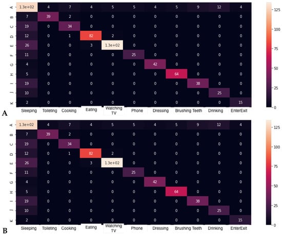 In this section, we evaluate the impact of including an advanced representation of sensors as baseline features. For inertial sensors, we included the aggregation function: maximal, minimal, average, and standard deviation, which are identified as a strong representation of acceleration data [27]. In the case of binary sensors, we included the last activation of the sensors and the current activation to represent the last status of the smart environment, which has brought about encouraging results in activity recognition [28,54]. These new features were computed to obtain an extended sensor representation.