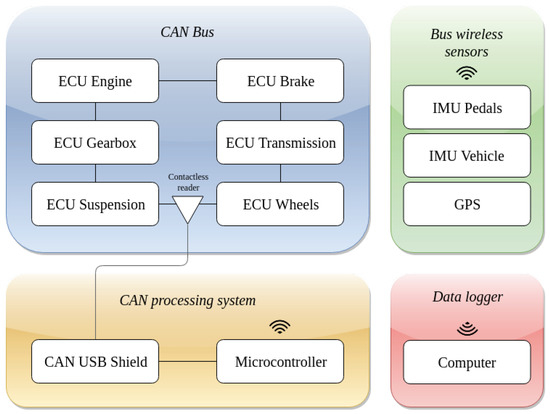 Diagram of the connections between the different data sources and the data logger. The external sensors communicate directly with the computer and the internal vehicle data are available from the CAN bus network employing a contactless reader. This data are then processed by a microcontroller and sent to the data logger.