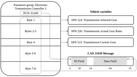 Some examples of PGNs are the Cruise Control/Vehicle Speed, Electronic Transmission Controller or Vehicle Dynamic Stability Control. Each group contains different information in the data field, classified by Suspect Parameter Numbers (SPN). Every message implements a different structure to fill its corresponding variables within the 64 bit data field, although not every data byte is always used. For instance, Figure 3 shows the full structure of the message Electronic Transmission Controller 2 (ETC2 with PGN 61445) that contains the actual gear ratio and both selected and current gears. A complete list of the used messages and variables for this project is available in Appendix A.