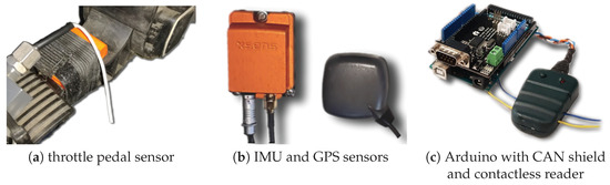 Figure 4 shows sensors and other electronic devices used for the data acquisition system. As inertial measurement units, three wireless motion trackers (Xsens MTw Awinda, Enschede, The Netherlands) were placed in throttle and brake pedals, as depicted in Figure 4a. Each tracker is a full IMU with the following components: three-axis magnetometer (full scale ±1.9 Gauss), three-axis gyroscope (full scale ) and three-axis accelerometer (full scale ). The dynamic accuracy of the orientation is rad for roll/pitch angles and rad for yaw angle, where both values are the quadratic mean, also known as root mean square (RMS).