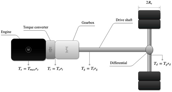 where is an engine’s maximum torque; is engine’s load, which depends on throttle pedal position and current velocity, among other things; is the transmission ratio of the torque converter; is the transmission gear ratio, which depends on the engaged gear; final-drive gear ratio of the differential; and is the effective tire radius, with R the maximum wheel radius and the reduction factor produced by vehicle’s weight and tire deformation.