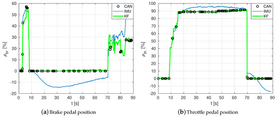 IMUs can be affected by bias due to calibration errors and other external effects, such as magnetic field perturbations. Thus, in the estimation, we have included an offset because there is an unmeasured drift produced by the integration of gyroscope and accelerometer’s biases. Hence, the state vector is expressed as , where * can be any super-index depending on the system/signal they represent (, ). The output measurement vector is , which includes pedal position measured by their respective IMU, or the value obtained from CAN bus for each signal. We assume that process noise vector is ; measurement noise vector is ; and system dynamics are described as: