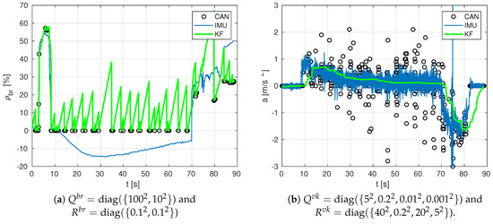 For a deeper understanding, Figure 8a shows the estimation of the brake pedal corresponding to the experiment of Figure 7a with an intentional choice of incorrect covariance parameters, which highlights the relevance of tuning these parameters in practical applications. Figure 8b also shows the relevance of correct choices of covariance parameters in acceleration estimates: the incorrect results in the figure can be compared against the correct ones in the bottom plot of Figure 9. As a consequence, the proposed values at the beginning of the section have been carefully selected so that they work properly in all available experiments.