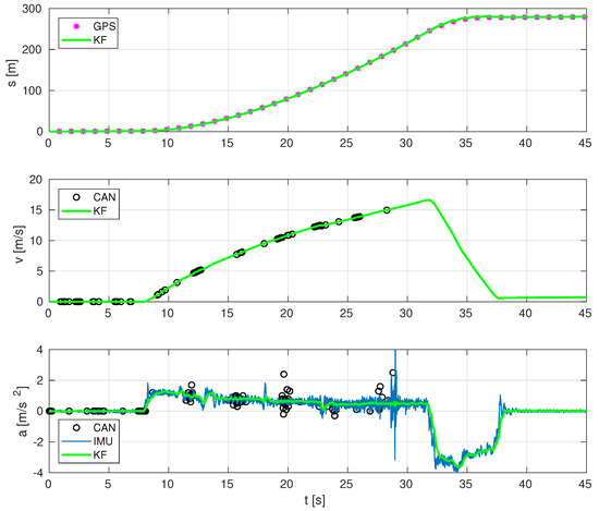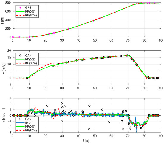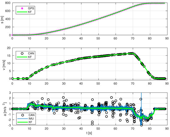 Figure 11 shows that our proposed sensor fusion works satisfactorily in an experiment driving up to 60 km/h and intense braking, and also the relevance of including CAN data. In this particular experiment, at a time of 28 s, CAN signal is lost. Before losing this signal, the estimation provided by our sensor fusion is reasonably good. However, when CAN signal is lost, IMU-GPS data provides acceptable position and acceleration estimates, as intuitively expected, but it is inaccurate in the speed estimation: an offset of approximately 1 m/s is present even with the bus being stopped (GPS readings are not constant), whereas, in the initial stages, as well as in Figure 9, such speed offset is not present when CAN data are available.