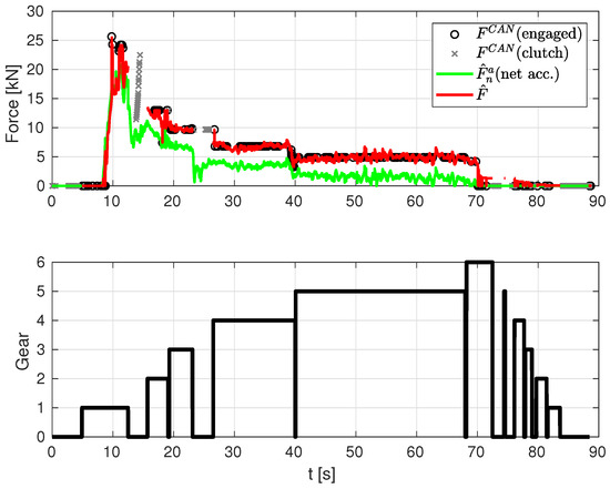Drive-train engine force estimation. Finally, Figure 10 depicts: the estimated drive net force without considering losses (green line) obtained from the estimated acceleration inserted into Equation (12); the estimated drive force considering losses (red line) obtained from sum of the two estimated states in Equation (13); and, lastly, the engine drive force measurements obtained from the CAN bus (black circles). As can be seen, the estimated drive force (red line) is close to the one obtained from CAN, which validates the method proposed in this paper. Note that the data segments where the clutch was active and no effective gear was engaged are not considered in this filter because the engine is “disconnected” from the powertrain (clutch status was retrieved from CAN bus signals).
