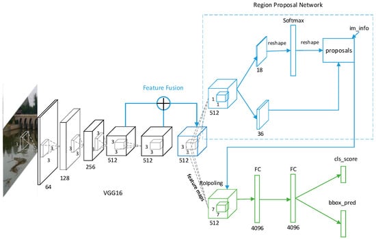 (2) Constructing a network model: Our network model is an improved Faster R-CNN. Feature fusion is utilized for feature extraction in order to improve the final detection accuracy. Besides, the different scales, aspect ratios, and numbers of anchors in RPN are set by analyzing the distribution.