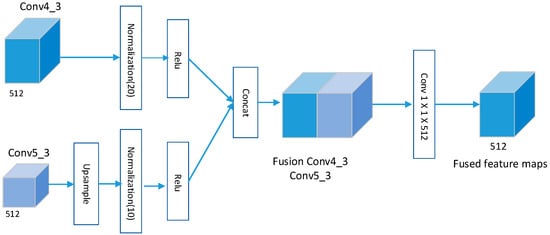 In the feature extraction stage, VGG16 is adopted as the backbone, which contains five convolution blocks (Conv1, Conv2, Conv3, Conv4, Conv5). Max pooling with kernel size and stride 2 is used after each convolution block. Therefore, the resolution of the feature is decreasing continuously. In addition, with the deepening of the network, the extracted feature becomes more abstract. In [], the results of CNN visualization show that high-layer features contain more semantic information but less detail information, while low-layer features contain more detail information but suffer from the problem of background clutter and semantic ambiguity. The experiments in [,] demonstrated that the supplement of low-layer and high-layer features can improve the detection effect for multi-scale objects. The information gained is an especially important supplement for small objects, which require the higher spatial resolution provided by low-layer features. Inspired by them, we propose to select the appropriate layer for feature fusion, instead of just using the last feature map for detection. In Section 3.2.1, it is mentioned that for objects of different scales, the extracted features are affected by the receptive field. In [], the feature extracted from the layer where the receptive field matches the object size is used to generate the region proposals for small objects. According to this idea, we believe that for small objects, when the receptive field matches the object size, more effective details can be extracted as a supplement to the high-level features.