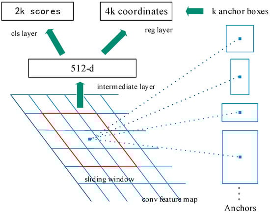 An RPN is a fully convolutional network which simultaneously predicts object bounding box and score at each position. The structure of the RPN is shown in Figure 4. The feature maps obtained by feature fusing are used as the input of the RPN, and the points of the feature maps correspond to the positions of the original image. A sliding window is used to slide on the feature maps. Each sliding window is mapped to a lower-dimensional feature. The center of each sliding window corresponds to k anchors, and each anchor corresponds to a size and aspect ratio. The anchors are set in different scales and aspect ratios to cover the objects of different scales. However, in the original RPN, there is no method to determine the scales, aspect ratios and numbers of the anchors. If the scales of anchors do not match the size of the objects in experimental dataset, the detection effect will be affected. Hence, we propose to determine the scales, aspect ratios, and numbers of the anchors by analyzing the distribution of the objects in our dataset.