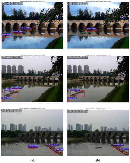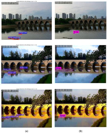 As can be seen from Table 3, the model with feature fusion had the better detection performance. In addition, feature fusion made the model more sensitive to small-scale objects, which will improve detection accuracy. The detection speed of Faster R-CNN with feature fusion was 11 FPS—slower than Faster R-CNN. The reason is that the extra feature fusion layer in the feature fusion model needs additional computation. However, our method still basically met the speed requirement of float detection. Figure 8a shows the detection result of Faster R-CNN with feature fusion, and Figure 8b shows the detection result of Faster R-CNN without feature fusion. It shows that the model with feature fusion could detect the water surface floats whether large or small. Therefore, it is important to fuse the high-level and low-level feature maps.