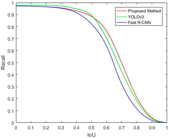 Recall–IoU curves of YOLOv3, Fast R-CNN, and the proposed method.