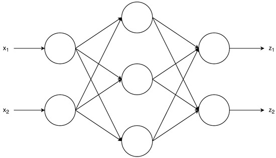 Example of feedforward neural network. Each circle represents a neuron, which combines in a nonlinear way its inputs following Equation (3). The inputs are and , and the outputs are and . There is a single hidden layer, which has three neurons. Note how each of the outputs z is a nonlinear combination of the inputs and .