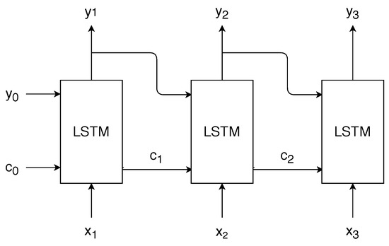 Illustration of the procedure of an LSTM for three timesteps. The output is updated in each timestep using Equation (5) and the cell state is updated using Equation (4). The LSTM block is composed of four neural networks, which are the same for all timesteps. Note that, in the first timestep, it is necessary to provide an initial and in order to obtain and .