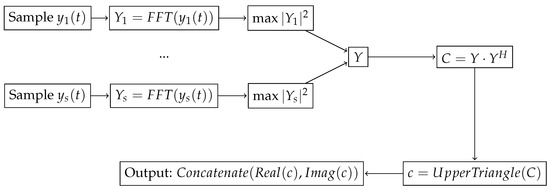 However, each component of the vector c is complex, and the neural network needs real numbers as input. Thus, we concatenate the real and imaginary parts of c in order to obtain the covariance feature vector, which has a dimensionality of components. Note that, if we did not take into account the fact that C is a Hermitian matrix, the feature vector would have components. The whole procedure can be observed in Figure 3.