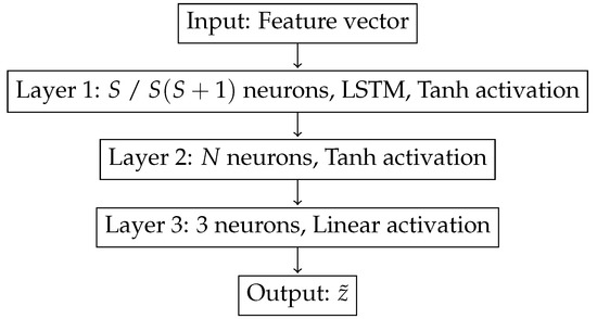 One of the most popular architectures to implement an RNN is the Long-Short Term Memory (LSTM) architecture [29], which we use in our work. In an LSTM, there is a cell state that is updated using the data input and the output of the LSTM, denoted by . The subscript t is used to denote the time index. An LSTM is formed by four different neural networks, with weights and biases , —see Equation (3). These four neural networks are used to update and as follows: