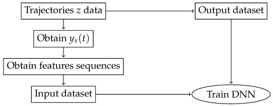 After that, we obtain the channel impulse response from each point of each trajectory to each sensor s using the procedure described in [14] with the parameters from Table 1 for 11 equispaced values in . Since the channel is time variant, we obtain a different channel impulse response for each trajectory point. The signal is filtered using the corresponding channel impulse response in order to obtain as in Equation (7). We also add to an additive white Gaussian noise, whose energy depends on the Signal-to-Noise Ratio (SNR) that we fix beforehand using three different values: dB. For each point z in each trajectory, we generate 100 different values for two reasons: to have a larger dataset, which helps with training the DNN, and to help the DNN deal with the effect of the Gaussian noise that we add at the receiver.