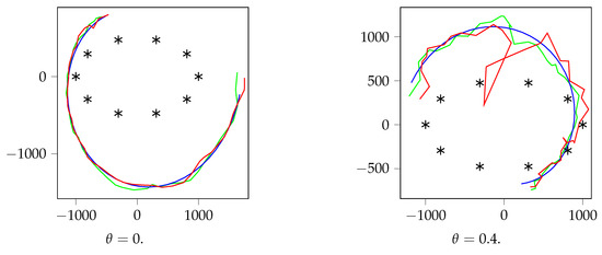 Finally, Figure 6 shows, for and and , two examples of validation trajectories and the prediction given by the localization DNN. It is possible to observe that, if the variability of the channel is not too large, i.e., is low, the localization DNN provides a good localization mechanism. Note that will depend on the concrete setting where we intend to deploy our locating sensor network, and thus locating using power or covariance and a DNN could be a good option. As we have indicated, using a localization DNN provides several other advantages.