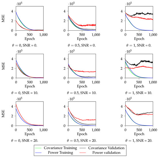Mean Squared Error (MSE) during training, when . We can observe that, for low and high SNR, the localization DNN converges to a low localization error. However, as increases, i.e., the channel becomes more variable, and SNR diminishes, i.e., the received noise signal increases, the localization precision significantly worsens. In addition, as increases and SNR diminishes, there appears overfitting: the validation values remain constant while the training values decrease, which means that there is a certain localization precision bound that our localization DNN is not able to improve.