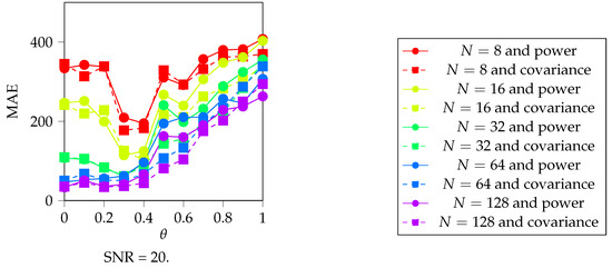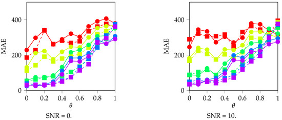 - Regarding , we reach the same conclusion as in Figure 7: as increases, the precision localization decreases, as the MAE increases. Note that this affects , all SNRs and both power and covariance features. This is no surprise at all: as we showed in the Introduction, the main obstacle to using power measures for locating purposes is precisely the complexities of the underwater channel.