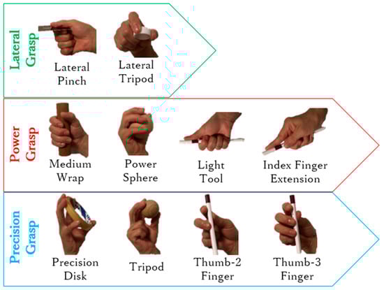 Ten most frequent types of grasps for experimental testing (adapted from Reference [13]).