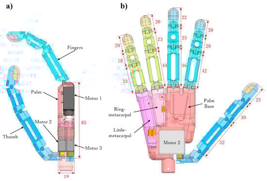 Three-dimensional (3-D) model of proposed prosthetic hand: (a) side view and (b) front view (unit, millimeters).