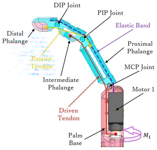 As the four fingers have the same mechanical structure and driving method, we only provide the details of one finger, as shown in Figure 5. Two kinds of tendons are employed for different purposes, namely, driven and passive tendons. The driven tendon crosses through the MCP and PIP joints to then connect to motor 1. The passive tendon is fixed between the proximal and distal phalanges, passing through the PIP and DIP joints. These tendon configurations allow the finger to perform adaptive grasps and to determine grasping trajectory.