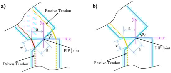 First, as motor 1 rotates (M1 in Figure 5), the driven tendon is rolled up to flex the MCP and PIP joints, thus providing adaptive flexion during grasps. In fact, the driven tendon induces flexion on the other phalanges until the object blocks motion on any or all the phalanges. Then, with the flexion of the PIP joint, the passive tendon is involved to flex the DIP joint together. The geometry of the PIP and DIP joints is shown in Figure 6. Taking the joint rotation axis as the origin, the driven and passive tendons are distributed symmetrically on both sides of the PIP joint. In Figure 6, is the angle of the PIP joint, a is the length constant between the origin and tendon, and s is the variable travel distance of the tendon. In the DIP joint, the same geometry is setup for the passive tendon. Thus, the passive tendon always travels the same distance s as the driven tendon, and hence, the rotation angle of the DIP joint, , is equal to . Therefore, the passive tendon ensures a determined trajectory of the DIP joint, which rotates along the joint axis with the same angular velocity as the PIP joint.