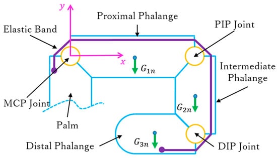 where i = 1, 2, 3 corresponds to the proximal, intermediate, and distal phalanges, respectively, and where j = 1, 2, 3 corresponds to the MCP, PIP, and DIP joints, respectively. Hence, is the gravity force of the ith phalange on the nth finger, is the maximum stretching on each joint of every finger, and is the initial stretching corresponding to each .
