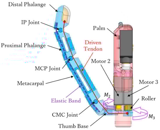 Motor 3 generates flexion and extension of the thumb. As shown in Figure 8, the driven tendon crossing through the interphalangeal (IP), MCP, and CMC joints is fixed to motor 3 through a roller. Rotation of motor 3 makes the driven tendon move the thumb in flexion or release the joints. As the driven tendon crosses through all the joints, an adaptive grasp can be achieved, as illustrated in Figure 9.