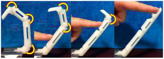 By considering the elastic band as a spring, the elastic constant for each finger can be represented as with for the index, middle, ring, and little fingers, respectively. Figure 7 shows a fully flexed finger, a position from which the elastic band should overcome every phalange gravity force for driving the finger back to the fully extended position. This can be regarded as a boundary state because, if the elastic constant is small, the finger cannot return to the fully extended position, whereas if the elastic constant is large, excessive elastic resistance is generated during grasping.