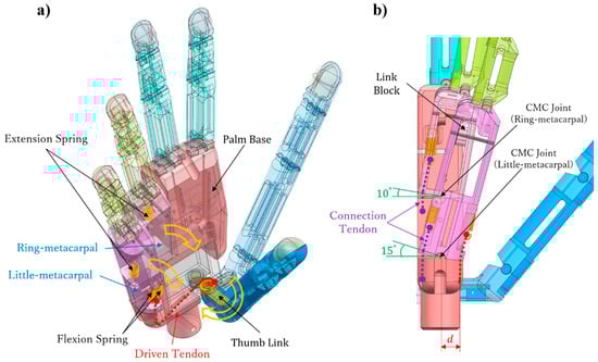 In Figure 14a, , , and represent the stretching of the extension springs in the ring- and little-metacarpals and that of the flexion springs, respectively. Figure 14b shows the CMC joint at the final arch state, where the little- and ring-metacarpals flex to their limits of 15 and 10°, respectively, and the thumb angle is as follows: