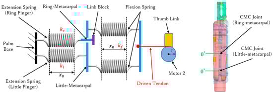 The no-load stage is divided into three steps. Step 1 corresponds to the initial position. The thumb is on the side of the fingers, and motor 2 has not engaged the driven tendon. Hence, the extension and flexion springs are balanced, and the metacarpals do not rotate. Figure 12a shows the diagram and geometry of the symmetrical spring structure, where is the stiffness of the extension spring connected to the little-metacarpal, is the stiffness of the extension spring connected to the ring-metacarpal, and r is the radius of the motor rotation axis. Figure 12b shows the 3-D hand model in the initial position, where the rotation on every CMC joint is zero. As is given in Equation (3), we obtain the following: