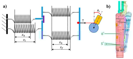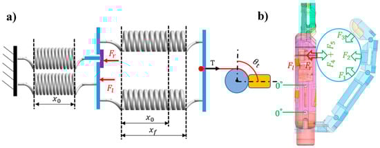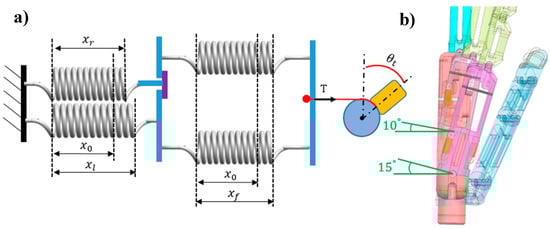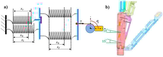Step 2 corresponds to the coupling position. Motor 2 starts rotating clockwise, and tension T through the driven tendon acts on the two flexion springs and is transferred to the extension spring in the little-metacarpal. Thus, the little-metacarpal starts to flex with the rotation of motor 2, and when flexed to 5°, the extension spring in the ring-metacarpal is coupled to that in the little-metacarpal through the link block. Figure 13 illustrates the coupling position, where the little-metacarpal extension spring is connected with the flexion springs in series (Figure 13a). The series spring stiffness can be calculated as follows: