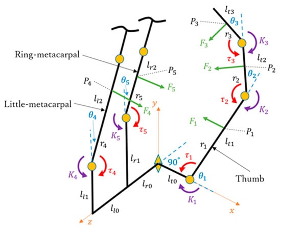 where i = 1, 2, 3 corresponds to the metacarpal, proximal, and distal phalanges, respectively, and where j = 1, 2, 3 corresponds to the CMC, MCP, and IP joints. Hence, is the gravity force of the ith phalange, is the maximum stretching on each joint, and is the initial stretching corresponding to each .