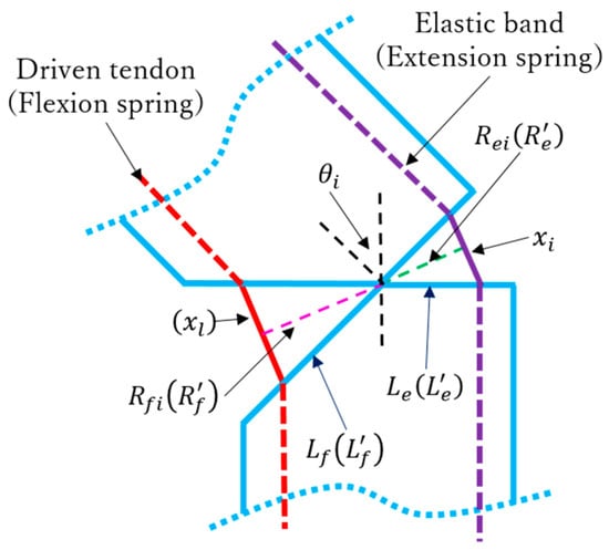 with being the rotation radius of motor 3, = 5 mm, and as the spring torque. When i = 1, 2, 3, and , where = 5/20.5. When i = 4, 5, . The geometric parameters are depicted in Figure 18.