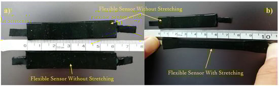 The proposed prosthetic hand design considers the tendon-driven transmission for the thumb and four fingers. The thumb uses one tendon to perform adaptive grasps, and the four fingers adopt two kinds of tendon mechanisms, enabling both adaptive grasps and a determined grasp trajectory. Given their similarity, we only verified the motion of one of the four fingers to determine the digit ability to perform movements as designed. Flexible sensors (ZM-C-CI-18-01, Z-Mirror, Shenzhen, China) were used in this experiment to measure the joint angles given their high malleability. Figure 20 shows the sensor before and after stretching.