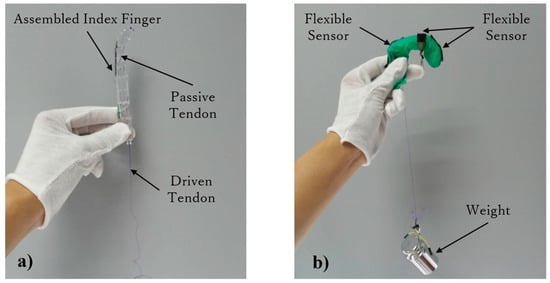 Figure 21 shows the experimental setup for this verification. Figure 21a shows an assembled index finger. Figure 21b shows an image of the experiment, where each finger joint fixes one flexible sensor and a weight draws the tendon to rotate the finger joints. We measured the sensor voltage changes on each finger joint under the action of different weights.