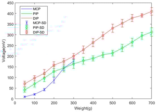 For this verification, we used 14 weights starting from 50 g with increments of 50 g, tested ten times. The results of the sensor measurements are shown in Figure 22, expressed with their average value and standard deviation. For weights from 50–300 g, the sensor voltages on the PIP and DIP joints are very similar, as expected by design. Although throughout finger flexion the angle of the PIP and DIP joints should remain the same in theory, inevitable measurement errors are reflected in the results. Consequently, from 350–700 g, the measured data from the PIP and DIP joints diverge.
