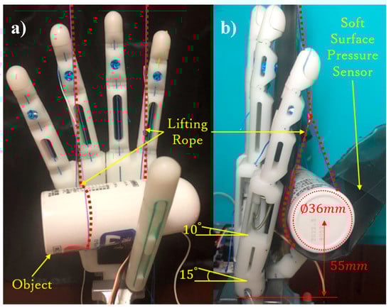 To verify the grasping ability for cylindrical objects of the arch analyzed in Section 3, we conducted an experiment performing arch motion. Figure 23 shows a cylindrical object (diameter 36 mm) lifted to a height of 55 mm to minimally allow the hand to contact the object performing the arch posture. Before the experiment, we set the hand to the initial contact position, as shown in Figure 23b, such that the thumb is adducted to 90° and the flexion angles of the little- and ring-metacarpals reach their flexion limits of 15 and 10°, respectively. Then, a 2-mm thick soft-surface pressure sensor (Tactilus bt5010-5101-16×5; Sensor Products Inc., Madison, NJ, USA) was wrapped around the object to measure the pressure acting on each phalange and metacarpal and to obtain the approximate position of the force contact points. It is worth mentioning that the implemented prosthetic hand weighs only 146 g, being notably below the suggested limit of 370 g [34].