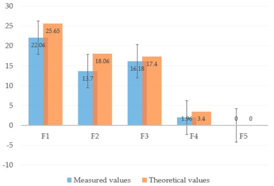 This experiment proceeded as follows. First, as motor 3 enwinds the driven tendon, the thumb begins to flex until the proximal phalange contacts the object, thus stopping the phalange. Then, the IP joint continues flexing until the distal phalange contacts the object. While motor 3 keeps rotating, the CMC joint starts to flex and the contact force transfers through the object to the little- and ring-metacarpals to make them finally extend and release the arch posture. During grasping, we recorded the angle using a digital angle ruler and measured the force on each phalange and metacarpal using the pressure sensor. As measurement or calibration errors are unavoidable, we repeated the experiment five times. According to Equation (27), the theoretical contact force can be calculated by assuming the same grasping condition as for the experiment. Figure 24 shows the comparison between the measurement results and theoretical values, in which the measurements are expressed with their average standard error. Although the measured values are lower than the theoretical ones, they are similar, with the divergence being explained by several influences such as friction loss and measuring errors.
