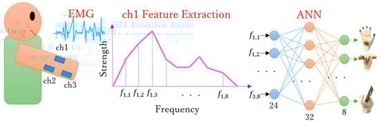 After completing the abovementioned motion verifications, we focused on the implementation of an intuitive control for the prosthetic hand [34]. For this experiment, we tested the operability and motion performance using real-time EMG-based control, as illustrated in Figure 25. First, EMG signals were collected from a subject’s forearm and then sampled to 2 kHz via analog-to-digital conversion using a microcomputer (SH72544R, Renesas Electronics, Tokyo, Japan). Next, eight-dimensional feature vectors were obtained through the fast Fourier transform in one independent channel. As there are three independent channels, 24-dimensional feature vectors were obtained and used as training or validation data for an artificial neural network. After training, the network returned one kind of hand motion through pattern recognition from real-time signals. Finally, the prosthetic hand performed the motion according to the identified motion [35,36,37,38].