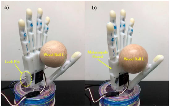 After the metacarpals are flexed to the final arch position, the thumb can continue adducting because its maximum rotation is 90°. From this moment, assuming that motor 2 is no longer idle, an object is grasped inside the arch. With the rotation of the thumb, the metacarpals extend passively to the initial position due to the increasing action force from the contact surface. As a result, the arch can switch between the sphere and medium wrap grasps. Figure 11 illustrates the metacarpal extension to the initial position from spherical grasp to medium wrap grasp.